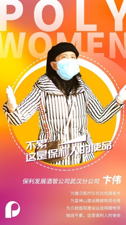 Bian Wei, working in Wuhan’s company subordinated to Poly Hotels, optimized accommodation conditions for the medical team dispatched to Wuhan, transferred goods in warehouse to construct Thunder God Mountain, and delivered donated supplies for the construction of mobile cabin hospitals. She said she’s not tired because it was the mission of every member of the Poly Group.